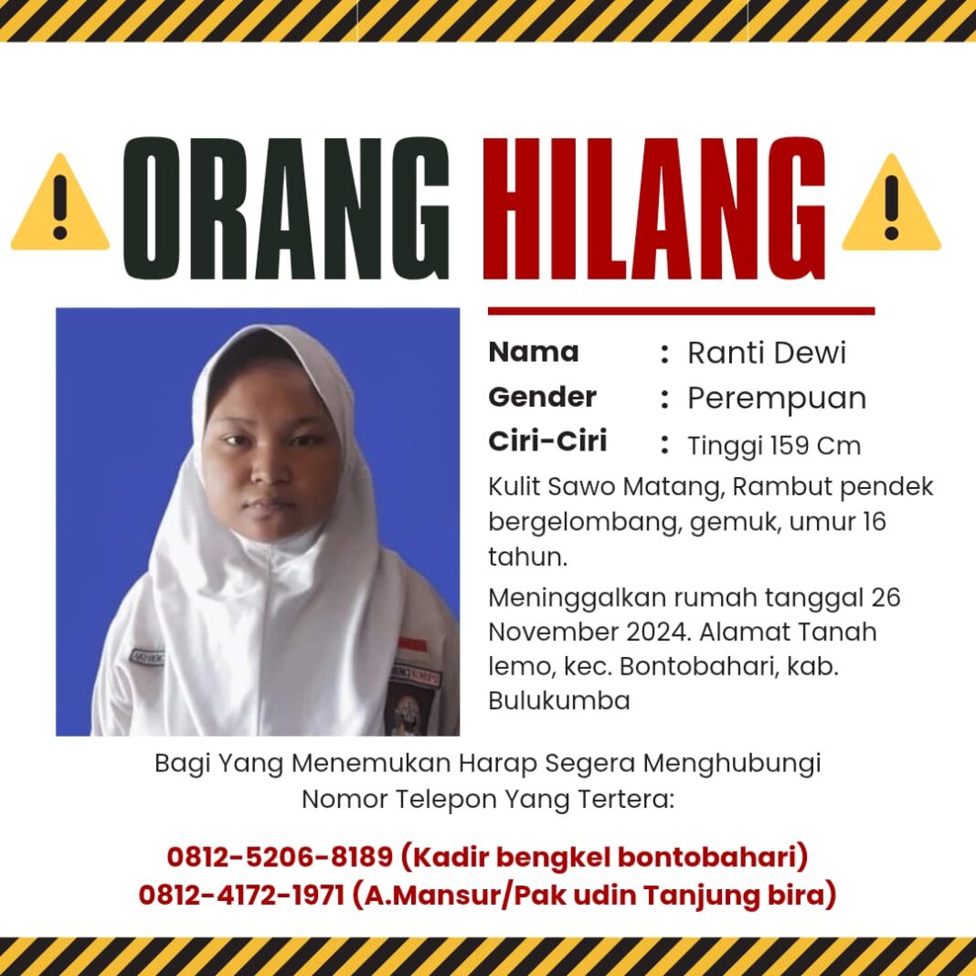 Ranti, seorang gadis 16 tahun dengan ciri kulit sawo matang, rambut pendek bergelombang, dan tinggi 159 cm, menghilang tanpa jejak.